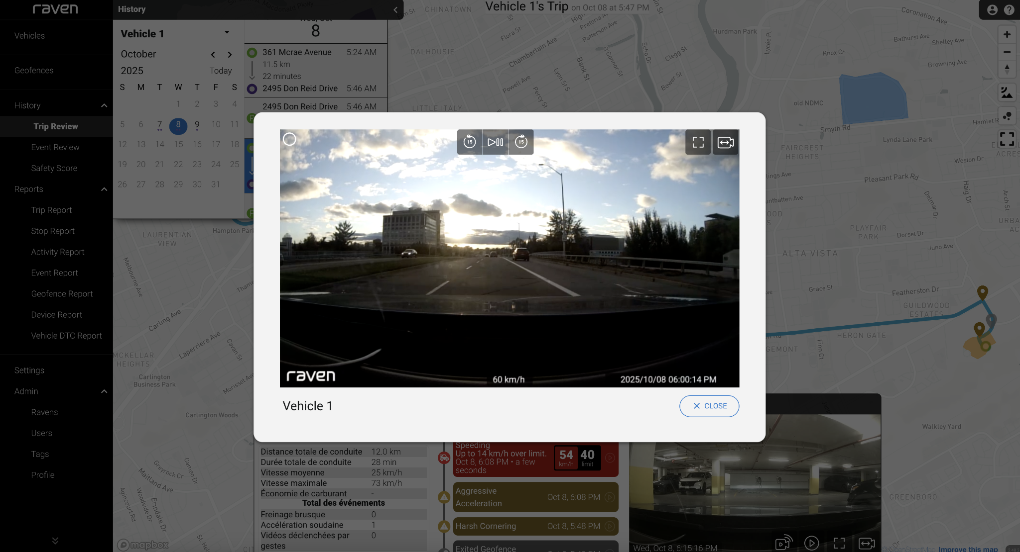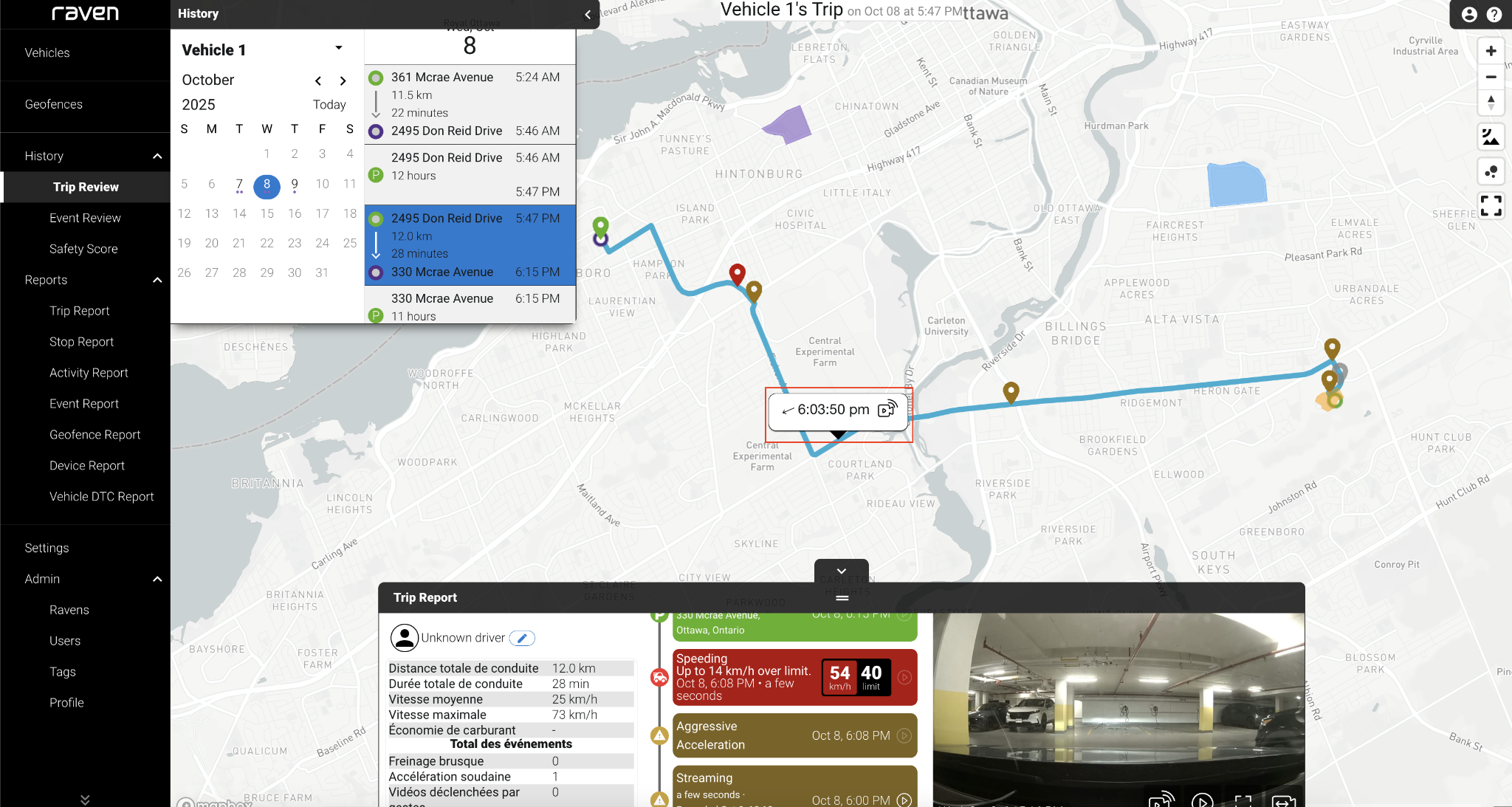 Historic Video Streaming enables users to review full footage from any trip available on the Raven device. Raven continuously records footage whenever the vehicle is on. If there is a portion of footage not covered by an Event, this feature provides a means to quickly access it without physically pulling the SD card from the Raven device. This footage is then made available via the web app for users to review.
