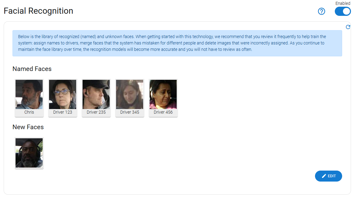 When Facial Recognition is enabled, Raven will begin collecting images of the driver while your vehicles are being driven. To create profiles for employees known as ‘Named Faces’: